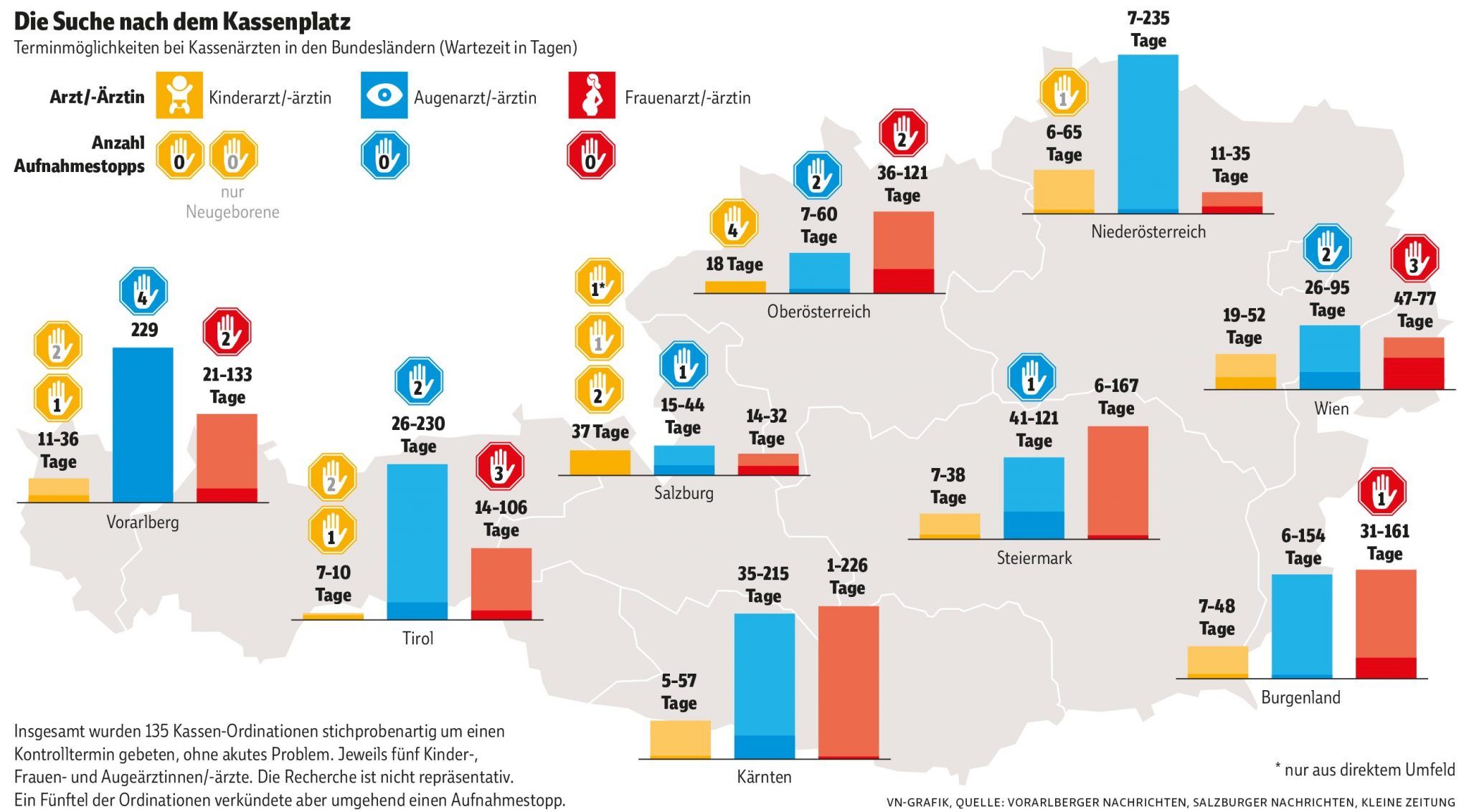 Die Ergebnisse unterscheiden sich regional stark. In Oberösterreich, Tirol und Vorarlberg ist es nahezu egal, ob man Kinder-, Frauen- oder Augenheilkunde braucht – auffällig oft heißt es am Telefon: „Es tut mir leid, wir können derzeit keine neuen Patienten mehr aufnehmen.“ Termine zu bekommen war einfacher in der Steiermark, Kärnten, Niederösterreich und dem Burgenland, wenn auch oft verbunden mit monatelangen Wartezeiten.